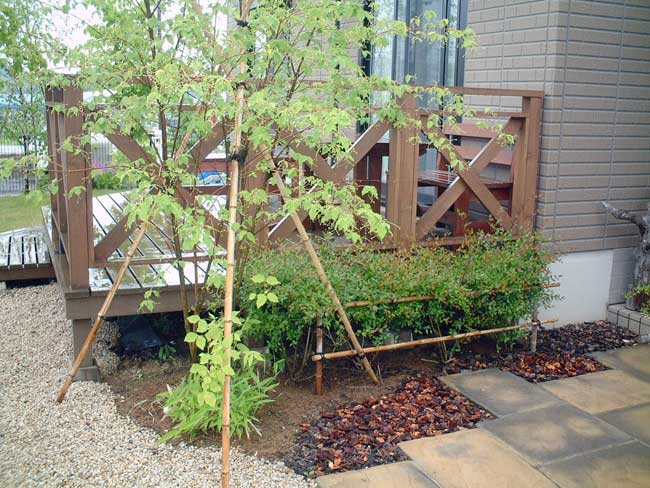こちらのお客様の庭には、最初からウッドデッキがあったので、 (御施主様がご自分で施工しました。)道路から良く見えてしまい、落ち着かないのでデッキが植栽越しになるように株立ちの木を植え、デッキの足元を隠すように、低木を植えました。